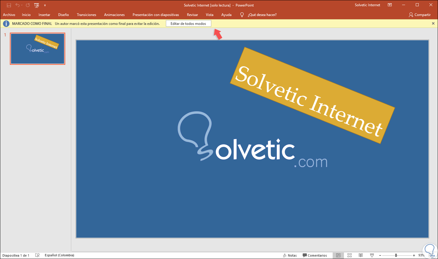 Ahora, cuando se acceda a la presentación, veremos la leyenda “MARCADO COMO FINAL” en la parte superior de la presentación. Si allí pulsamos en el botón “Editar de todos modos” se quitará esta leyenda y podremos seguir usando la diapositiva y aplicar cambios en ella.