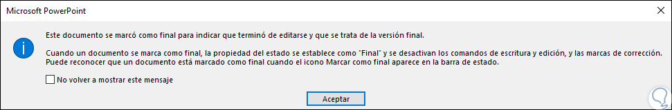 Pulsamos en Aceptar y de esta manera hemos eliminado la contraseña de la presentación de PowerPoint 2016 o 2019: