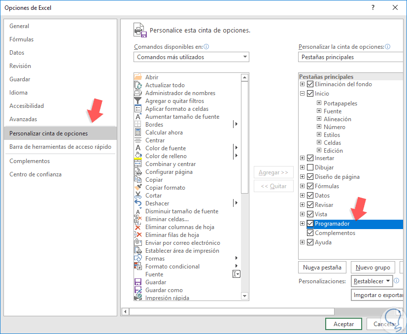 Al dar clic allí se desplegará una ventana emergente, en ella ubicamos la sección “Personalizar cinta de opciones” y en el costado lateral derecho activamos la casilla “Programador”. Pulsamos en Aceptar para añadir este nuevo menú en Excel 2019.