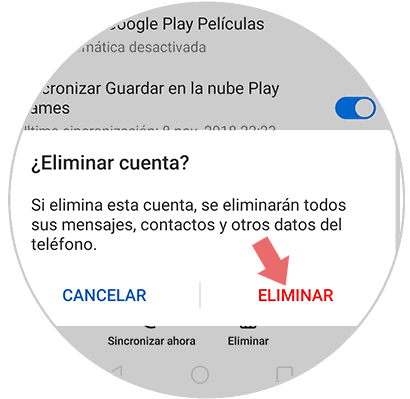 Verás que aparece una ventana emergente en la que se informa que, si borramos esta cuenta, se borrarán todos los mensajes, contactos y otros datos del teléfono. En el caso de que estemos de acuerdo con esto, seleccionamos “Eliminar”.