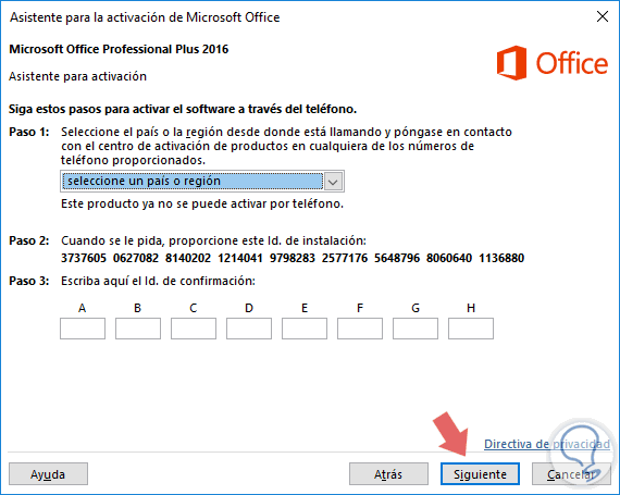 Al seleccionar esta opción damos clic en Siguiente y debemos seleccionar el país o región actual y luego llamar al número de teléfono del centro de activación de productos según el país o región seleccionado: