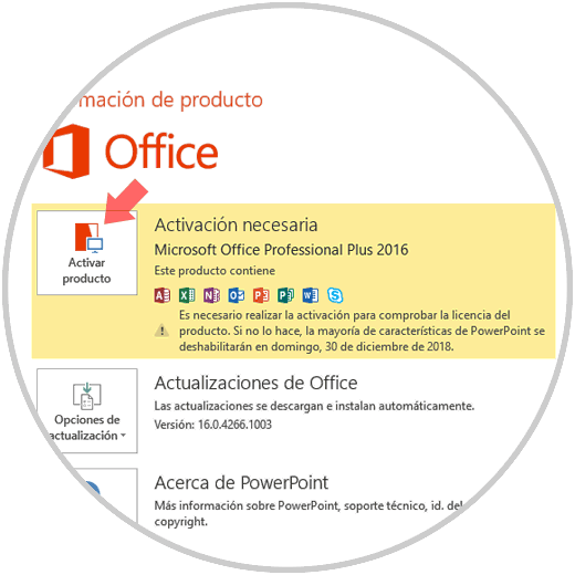 Cuando PowerPoint se encuentra desactivado veremos la siguiente advertencia en la aplicación en la ruta Archivo / Cuenta: