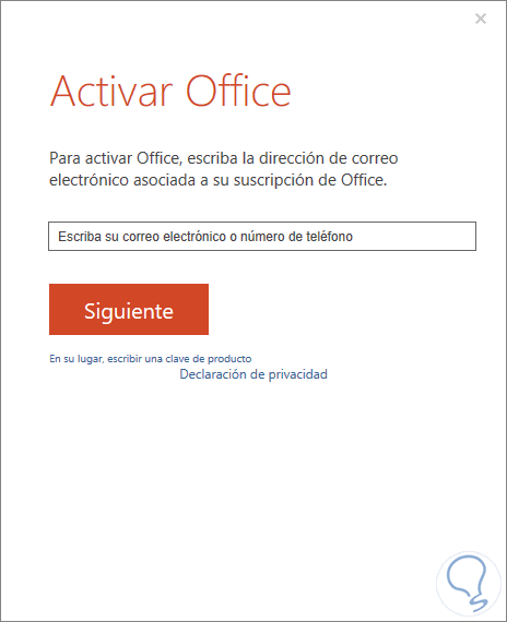 En caso de no contar con una suscripción a Office, posiblemente se compro el DVD de Office con PowerPoint, en esta caja se incluye la clave del producto la cual es un código de 25 caracteres que esta impresa allí, está la ingresamos siendo cuidadosos de ingresar cada letra correctamente, si deseamos usar este método damos clic en la línea "En su lugar", escribir una clave de producto y será desplegado lo siguiente: