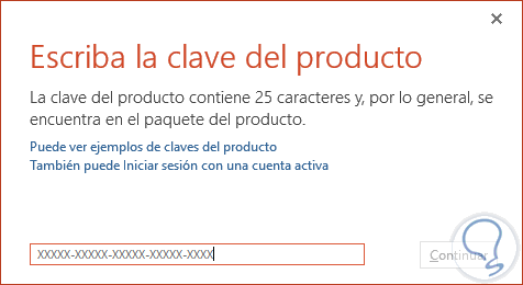 Allí ingresamos la clave y damos clic en Continuar para seguir con el proceso de activación de PowerPoint 2016 o 2019.