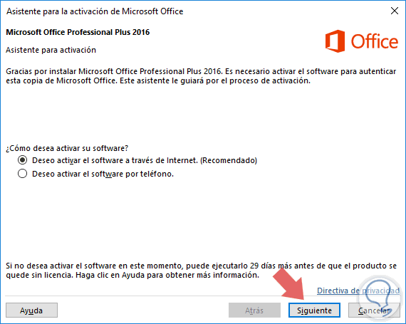 Luego de esto pulsamos en Siguiente y seguimos el proceso de activación.