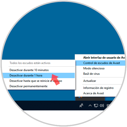 Una forma simple para descartar que nuestro antivirus sea el causante de este error es desactivándolo por un periodo de tiempo. Esto nos permitirá validar si con el antivirus desactivado el error sigue generándose. En base al antivirus instalado, debemos ir a las notificaciones en la barra de tareas de Windows 10 y allí dar clic derecho sobre nuestro antivirus. En este caso con Avast, seleccionar la opción “Control de escudos de Avast” y allí determinar cuánto tiempo se ha de desactivar éste: