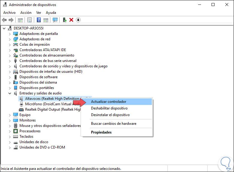 En la ventana desplegada debemos detectar el controlador a actualizar, dar clic derecho sobre él y seleccionar la opción “Actualizar controlador”: