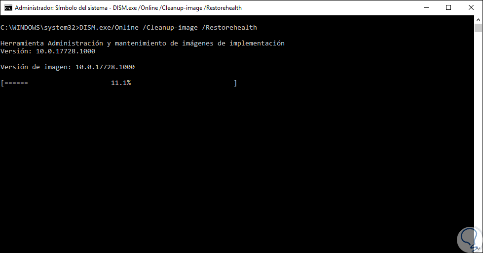 En caso de que el comando SFC no corrija el error, podemos recurrir a otro comando como lo es DISM (Deployment Image Servicing and Management - Administración y mantenimiento de imagen de implementación) la cual se encarga del mantenimiento y gestión de las imágenes del sistema. Para usar esta opción, en la consola del símbolo del sistema o de PowerShell, ejecutamos lo siguiente. Este proceso puede tardar entre 20 a 30 minutos.