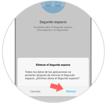 Ahora nos aparecerá un mensaje de advertencia preguntándonos si estamos seguros de que queremos borrar el segundo espacio creado. Ten en cuenta que se eliminarán todos los datos de aplicaciones que ahí se encuentren. Si es así elige “Eliminar”.
