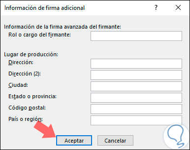 Podemos pulsar en el botón "Detalles" con el fin de añadir mucha mas información, si deseamos, al firmante. Una vez ingresemos los datos necesarios pulsamos en "Aceptar".