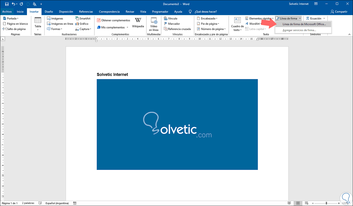 Para este proceso, abrimos un nuevo documento y ubicaremos el puntero en la línea donde aparecerá la firma. Después de esto vamos al menú "Insertar" y en el grupo "Texto" pulsamos sobre la opción "Línea de firma" y allí seleccionamos la opción "Línea de firma de Microsoft Office":