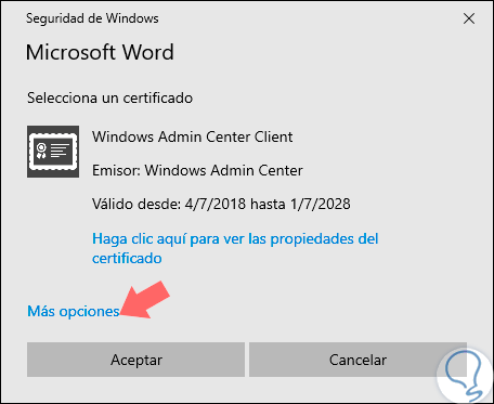 En la sección "Firmar" podemos hacer uso de certificados digitales si disponemos de esta alternativa, para ello pulsamos en Cambiar y en la ventana de seguridad de Windows veremos lo siguiente. Allí pulsamos en la línea "Más opciones" para visualizar todos los certificados disponibles y firmar con dicho certificado. Pulsa en "Aceptar".