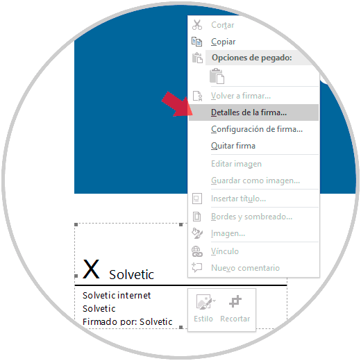 En caso de desear editar la firma, daremos clic derecho sobre esta y seleccionamos la opción "Detalles de la firma":