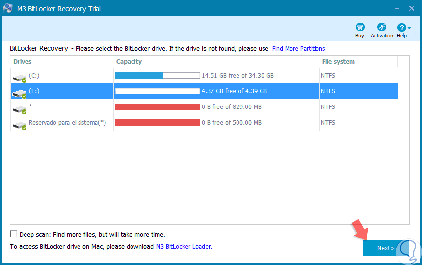 Su enfoque está más basado en la recuperación de datos en las unidades con error, cuando lo ejecutamos será desplegada la siguiente ventana donde seleccionaremos la unidad cifrada: