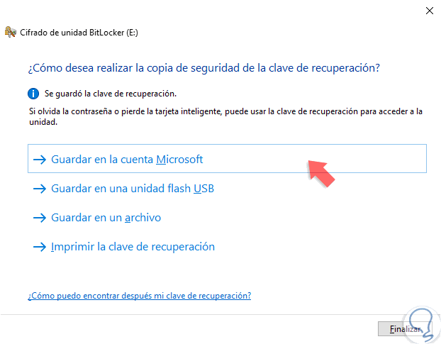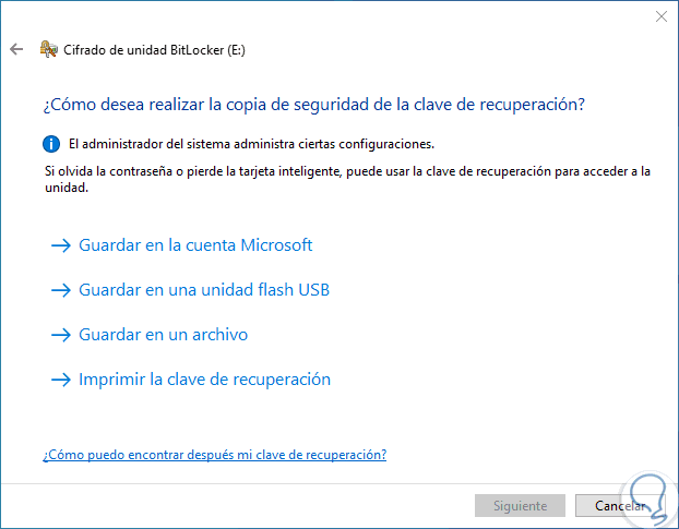 Allí se disponen una serie de opciones para almacenar la contraseña de recuperación de BitLocker. Ésta es una clave especial que se crea al momento de activar BitLocker por primera vez en cada unidad a cifrar y puede ser usada para obtener acceso al equipo si la unidad del sistema operativo está cifrada mediante el cifrado de unidad BitLocker y BitLocker encuentra un parámetro que impide el desbloqueo de la unidad en el proceso de inicio.