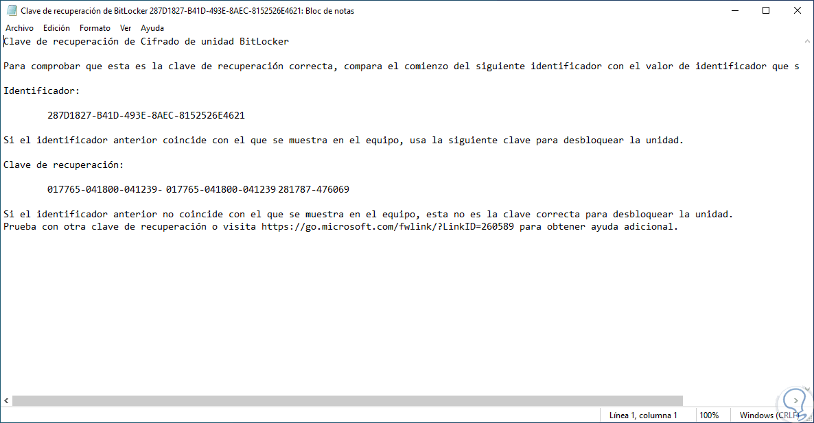 Esto creará un archivo de texto donde veremos el contenido del archivo creado. Allí podremos guardar la clave de recuperación de BitLocker.