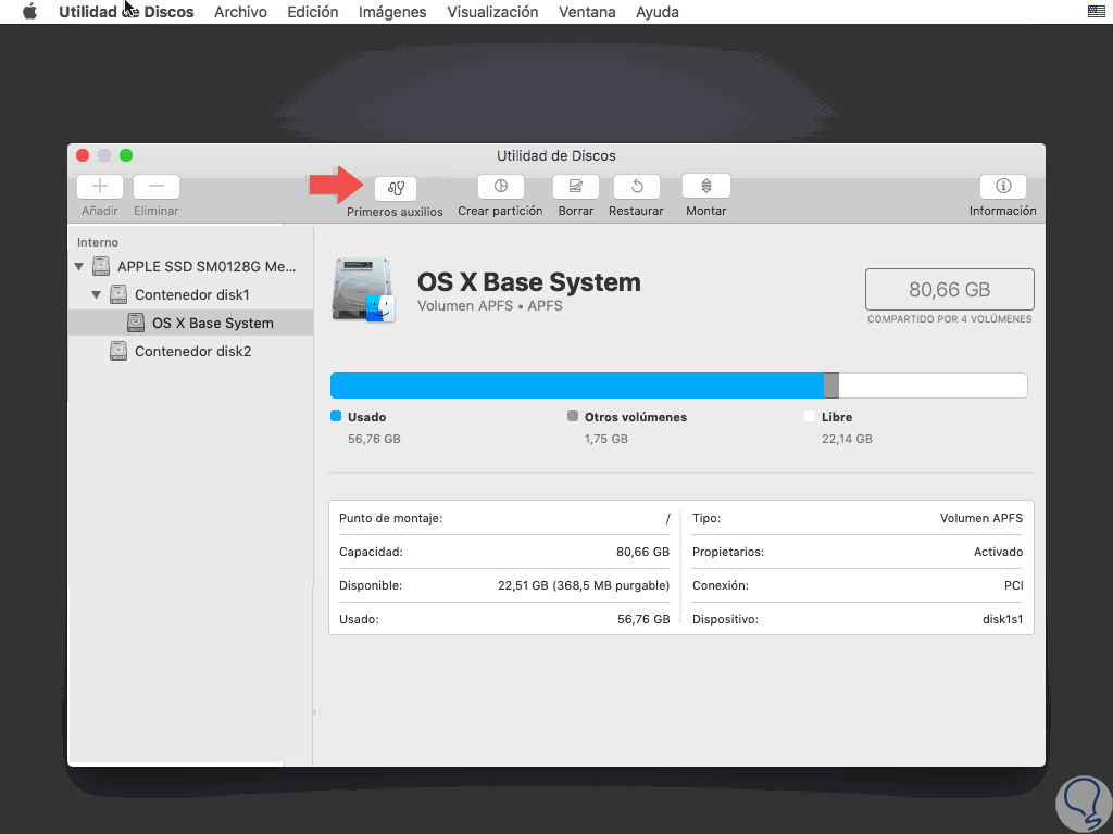 Al acceder a la opción “Utilidad de discos” veremos lo siguiente. Allí seleccionamos el disco principal y podemos ver que se integra una función llamada "Primeros auxilios" la cual actúa en unidades que pueden estar dañadas y proceder a corregir las fallas que está presente.