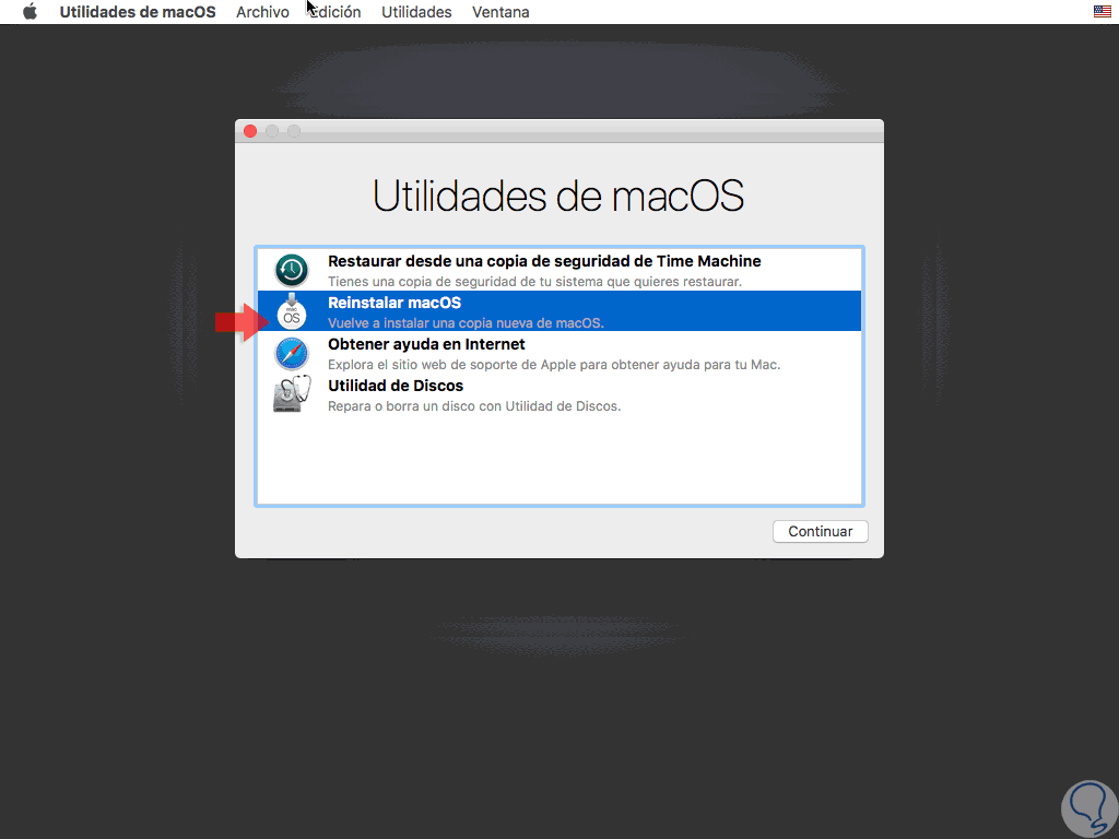 Para hacer uso de esta opción vamos a la ventana principal de recuperación y allí seleccionamos la opción “Reinstalar macOS”: