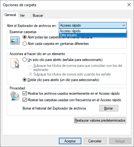 - En la zona "Abrir el Explorador de archivos en:" Selecciona: "Este Equipo"