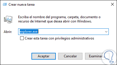 En la ventana desplegada ejecutamos el comando “explorer.exe”. Pulsamos en el botón “Aceptar” para reiniciar de nuevo el proceso del Explorador.