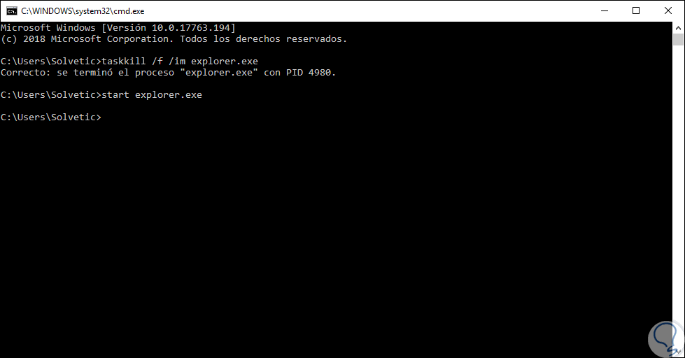 taskkill /f /im explorer.exe (Con este comando finalizamos el proceso explorer.exe) start explorer.exe (Con este comando iniciamos el proceso explorer.exe)