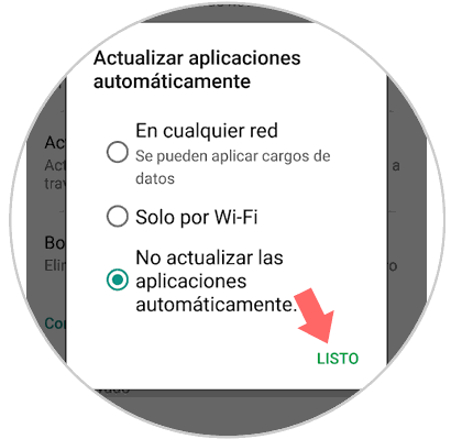 Aparecerá una ventana emergente, en la que puedes seleccionar cuando quieres que se realicen las actualizaciones de Apps. Selecciona “No actualizar las aplicaciones automáticamente” y “Listo” y habrás terminado.