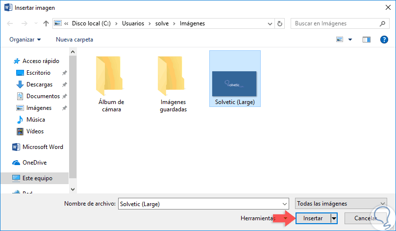 Si deseamos añadir la imagen de forma local o podemos dar clic en la opción “Imágenes en línea” y si deseamos añadir la imagen directamente de la red, en este caso usaremos la opción “Imágenes” y en la ventana desplegada ubicaremos la imagen a añadir: