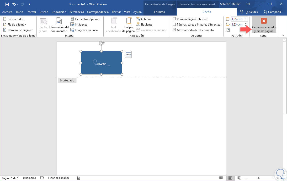 Notemos que se activa el menú “Formato” donde podremos aplicar cambios a la imagen como estilos, recortes, correcciones y más. Definido esto vamos a la pestaña “Diseño” y allí pulsamos en el botón “Cerrar encabezado y pie de página” ubicado en el grupo “Cerrar”: