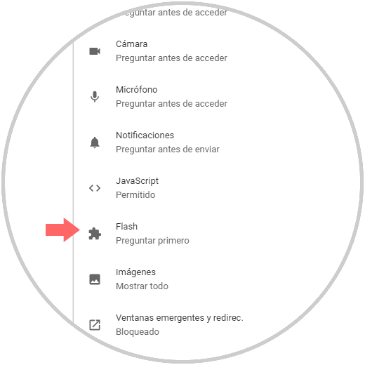 Al acceder a la configuración del contenido de Google Chrome ubicaremos la línea “Flash” la cual está por defecto con la opción “Preguntar primero”: