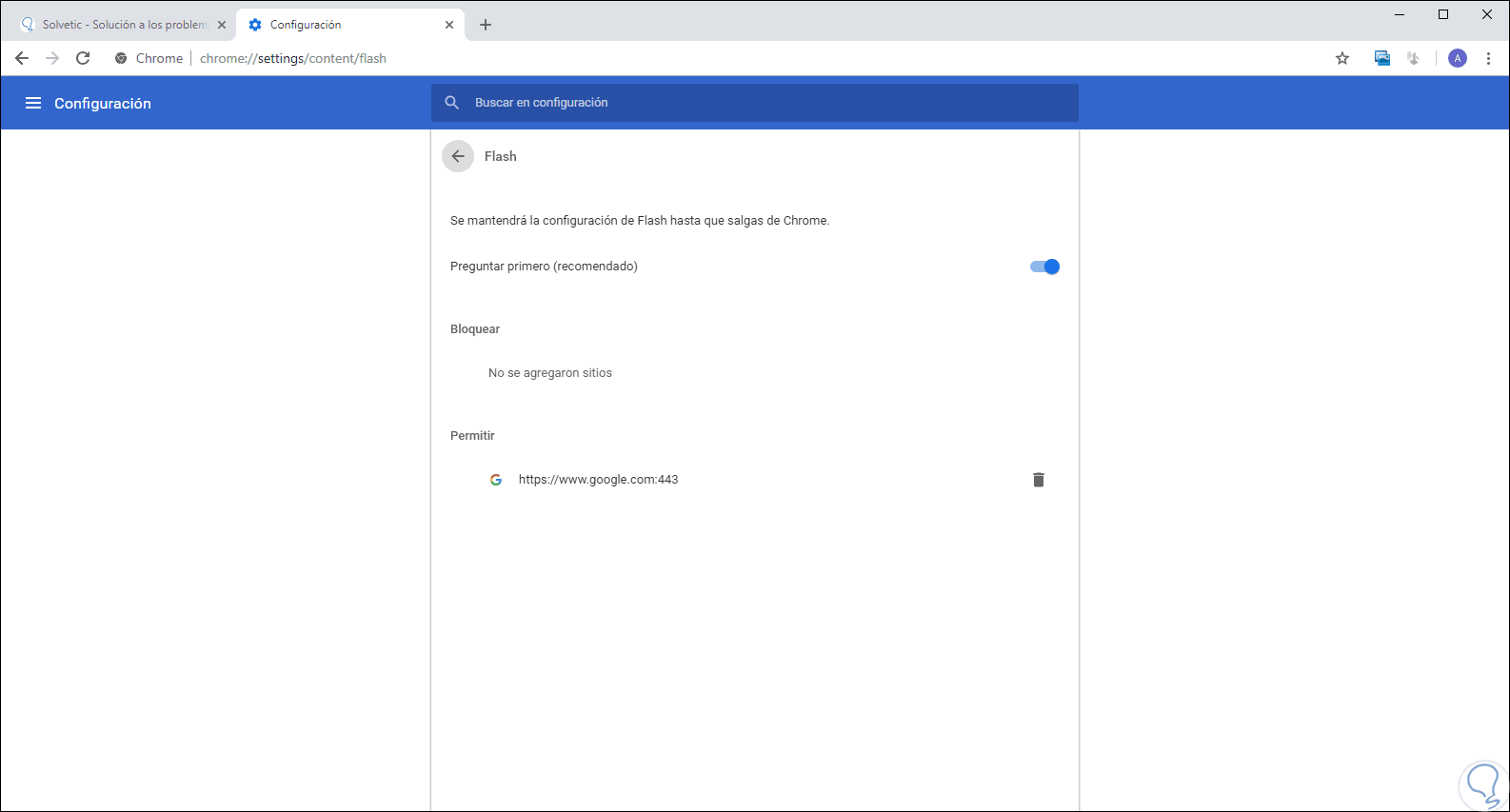 Como podemos ver, de esta forma será posible permitir el reproductor Flash Player solo en algunos sitios web en Google Chrome.
