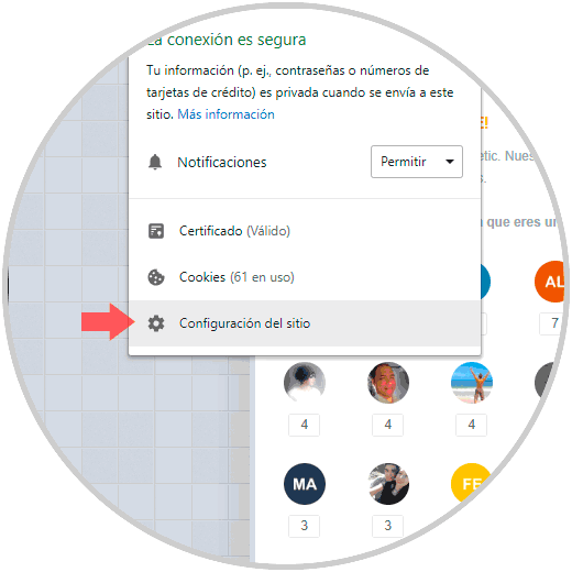 Ahora, vamos al sitio web deseado y pulsamos en el botón de información del sitio y allí seleccionamos la opción “Configuración del sitio”: