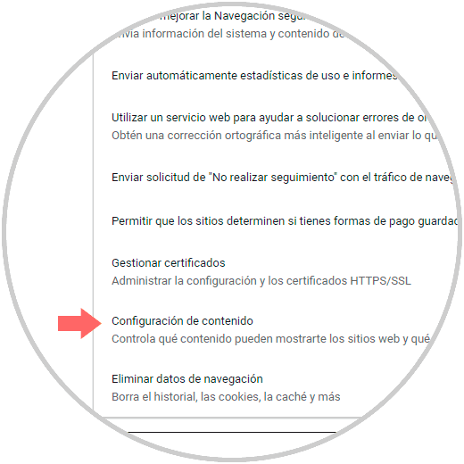 En la siguiente ventana pulsamos en “Avanzada” y en la sección “Privacidad y seguridad” ubicamos la sección “Configuración de contenido” o bien podemos acceder directamente ejecutando “chrome://settings/content” en una nueva pestaña: