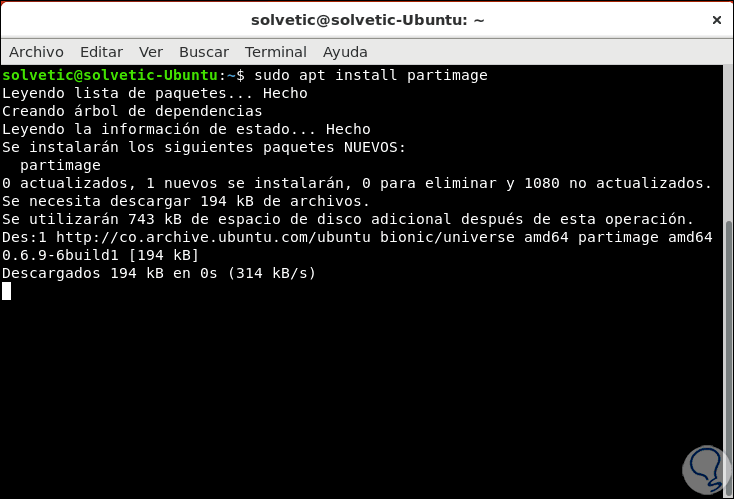 El primer paso será instalar la utilidad ejecutando lo siguiente. Ingresamos la letra S para confirmar el proceso de descarga e instalación de Partclone.