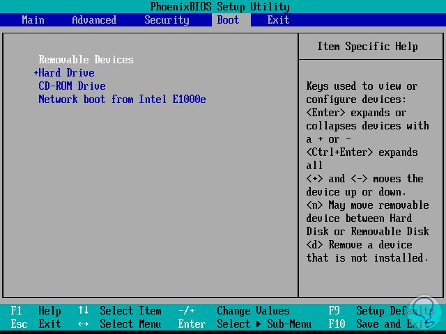 Luego de esto será necesario acceder al BIOS o UEFI del equipo donde se ha de clonar el disco y configurar el arranque ya sea desde el DVD (CD-ROM Drive) o desde el USB (Removable Devices):