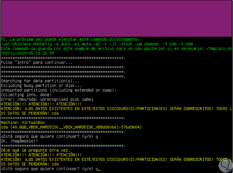 Pulsamos Enter para confirmar y luego recibiremos el siguiente mensaje advirtiendo que se borrarán los datos en el disco de destino: