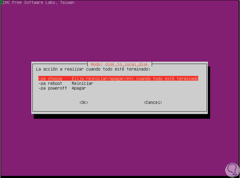En la siguiente ventana podemos configurar que acción se ejecutará cuando el proceso finalice, podemos apagar o reiniciar el sistema o también lanzar la pregunta al final:
