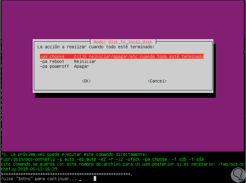 Cuando este proceso finalice seleccionaremos que acción realizar. Con estos simples pasos, Clonezilla se convierte en una solución integral y práctica para clonar un disco duro o partición en Linux.