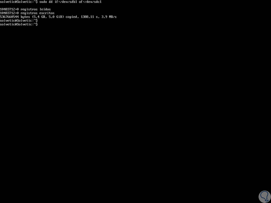 Ahora, vamos a clonar la partición /dev/sdb1 en /dev/sdc1 de modo que ejecutamos lo siguiente: