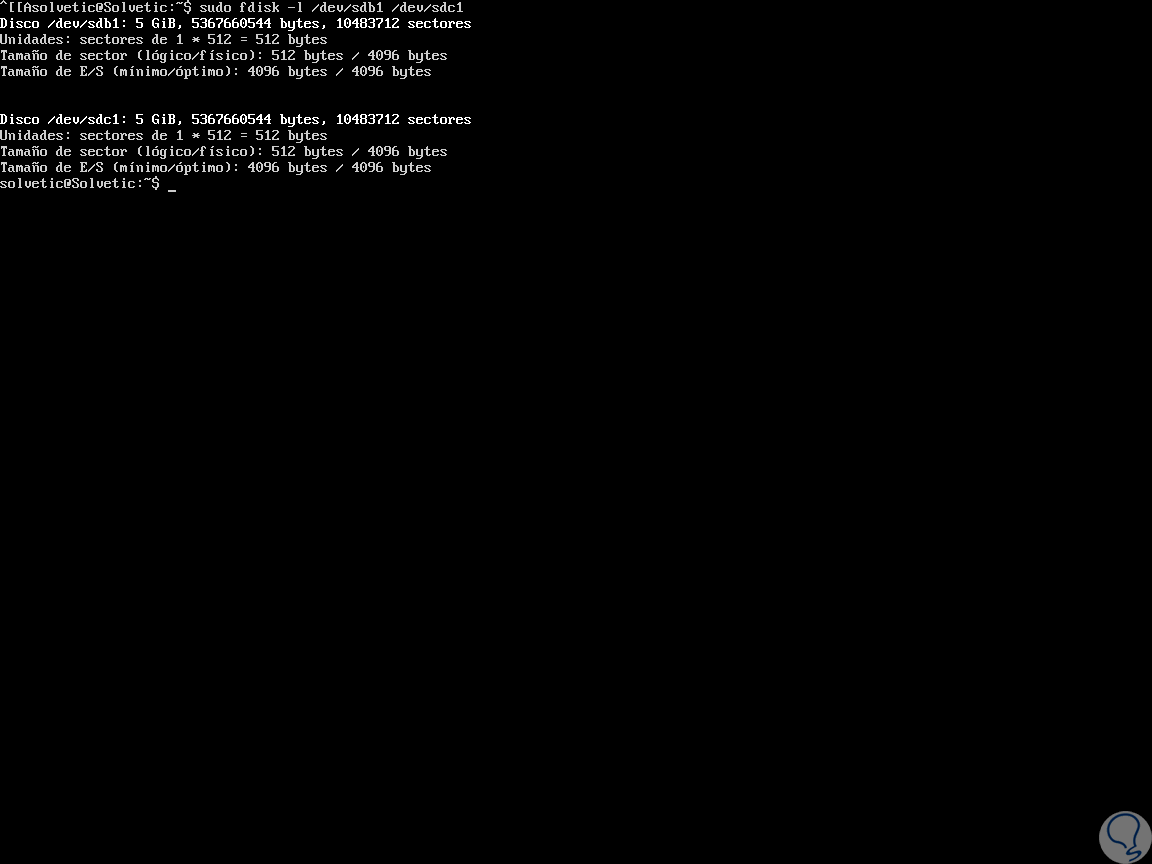 Para dar inicio a este proceso es necesario saber que particiones disponemos en el sistema, esto lo logramos con el comando “fdisk -l”, en este caso disponemos de las particiones /dev/sdb1/ y /dev/sdc1 por lo cual podemos listarlas ejecutando: