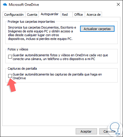 En la ventana emergente iremos a la pestaña Autoguardar y allí debemos verificar que la casilla “Guardar automáticamente las capturas de pantalla que haga en OneDrive”. Pulsamos en Aceptar para aplicar los cambios.