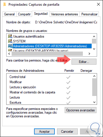 Los permisos son un factor esencial para que Windows 10 pueda alojar las capturas en dicha carpeta, esto significa que si nuestra cuenta no posee los permisos adecuados las capturas no podrán ser guardadas allí ya que se denegara el acceso.