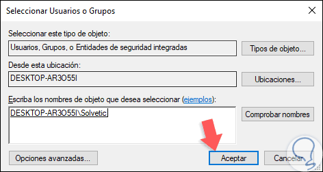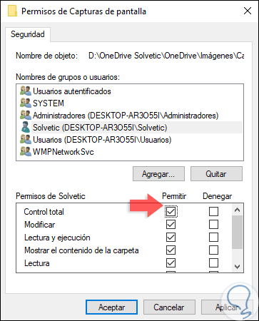 Pulsamos en Aceptar y posteriormente activaremos la casilla “Control total” con el usuario seleccionado. Pulsamos en Aplicar y Aceptar para guardar los cambios.