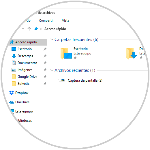 Cuando capturamos una pantalla en Windows 10 con las teclas indicadas podemos ver que por un lapso de segundos la pantalla se oscurece, esto significa que se ha tomado la captura, pero en la carpeta por defecto no existe dicha imagen, es necesario validar en que ruta Windows 10 está guardando las imágenes capturadas. Para verificar esto accedemos al Explorador de archivos de Windows 10 y allí iremos a la sección “Acceso rápido” y en la categoría “Archivos recientes” veremos la captura de imagen con su respectiva ruta de alojamiento: