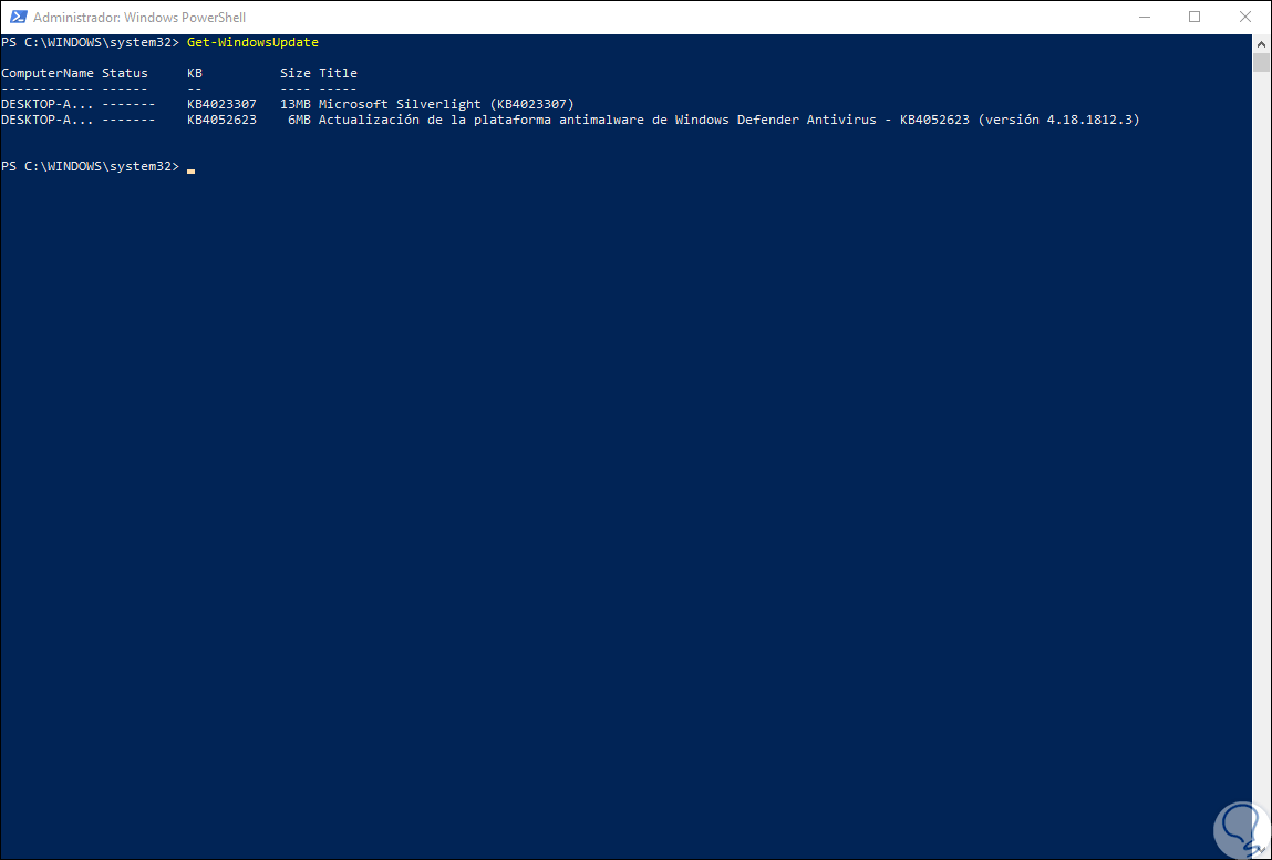 Cuando este proceso concluya podemos ver qué actualizaciones han sido instaladas en Windows 10 a través de Windows PowerShell: