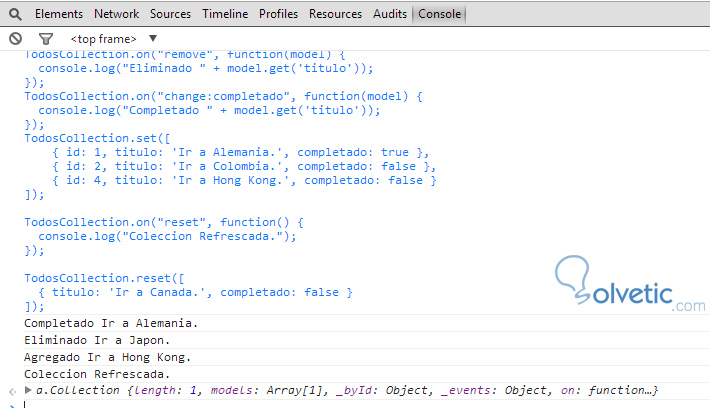 Vemos que al hacer el reset de la colección efectivamente no se disparan los eventos declarados en un principio de eliminar modelos, ni de agregar, esto es porque estamos refrescando la colección es decir creándola como si fuese desde 0.
