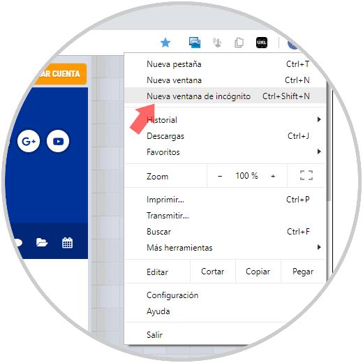 - Ir al menú de Google Chrome y allí seleccionar la opción Nueva ventana de incógnito