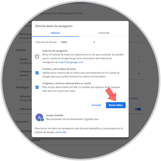 - Debemos activar las casillas Cookies y otros datos de sitios e Imágenes y archivos almacenados en cache