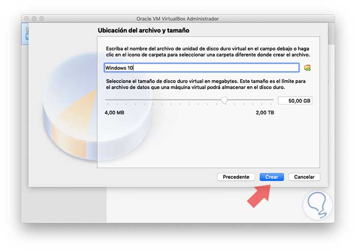 Finalmente asignamos el nombre para el disco duro virtual y definiremos su tamaño: