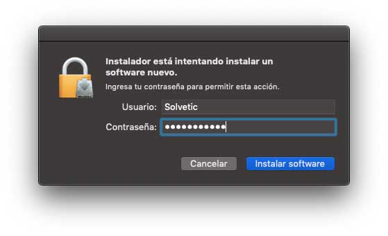 Definido esto pulsamos en el botón "Instalar" y será necesario que ingresemos la contraseña de administrador para validar el proceso:
