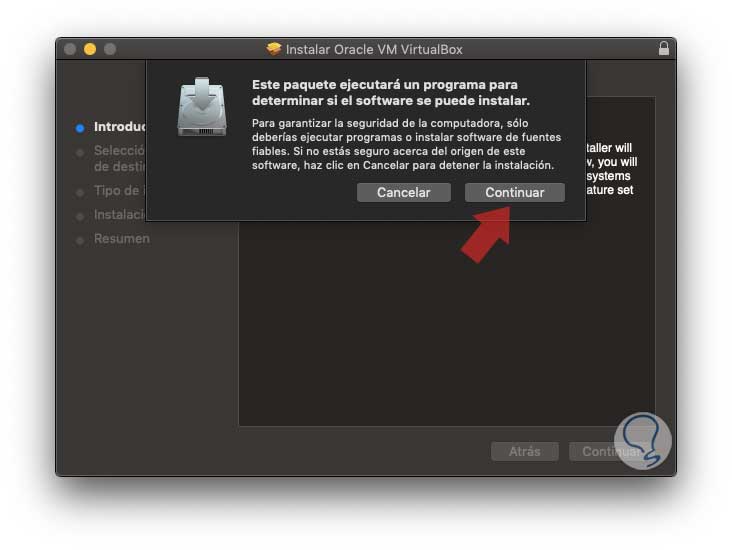 Allí damos doble clic en la opción "VirtualBox.pkg" para dar inicio a la instalación, será desplegado el siguiente asistente:
